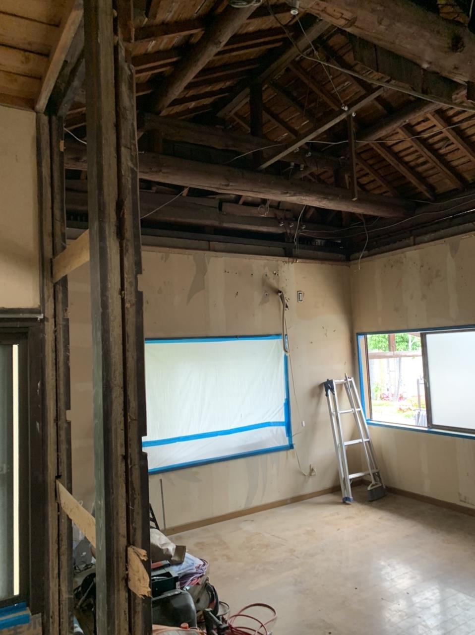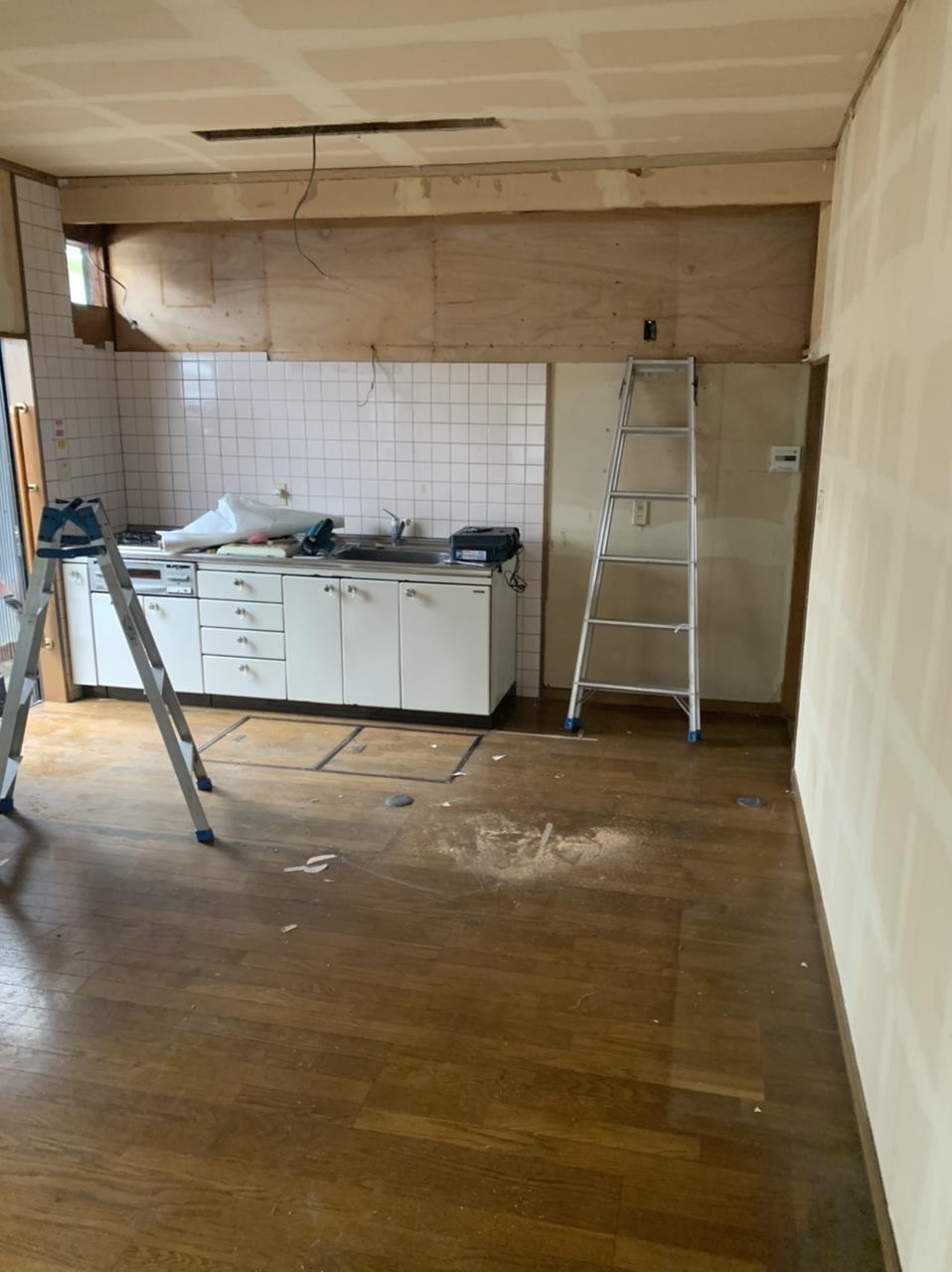 キッチンと隣合わせの部屋を一部屋にするので壁も解体し、天井も繋げるため解体しました。古民家ということもあり土壁で解体は大変でしたが上手く解体できました。解体作業中気付きましたがこの家を建てた大工さんは良い仕事をしてました。負けないように私も全力を尽くします。
