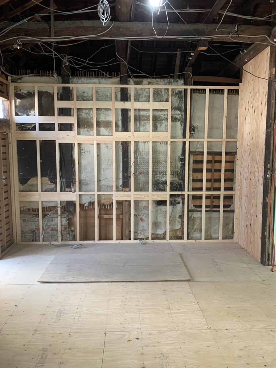 床のフローリングを張る前の下地として捨て張りで12㎜の構造用合板を張りました。部屋を1つにする為に壁を解体したので構造的に弱くなったのを補強する為片方の出入り口を塞ぎ耐力壁としました。そこを冷蔵庫置き場として使用すれば丁度良いという事もありそうしました。キッチンの背中になる部分の壁の下地を施工しました。元々昔ながらの古民家という事もあり垂直方向があまり良くなかったのでそれを直しつつ通りを通しながらの施工となりました。
