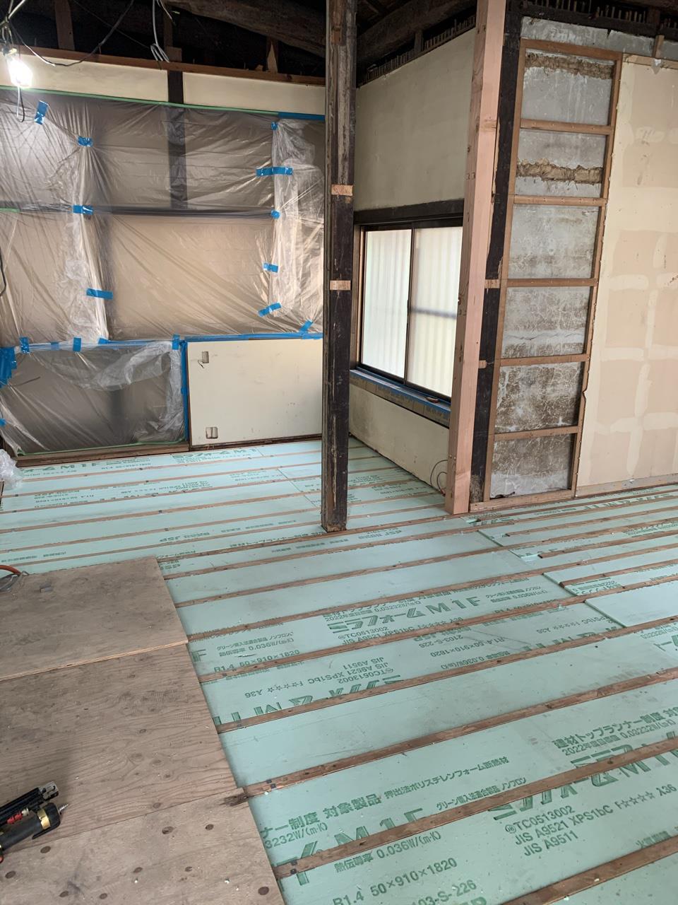 キッチンと繋げる部屋の土台と根太が長い時間の中で湿気等により傷んでいたので新しいものにやりかえました。現場の状況を考え手加工した方が良いと考え現場で加工し新設しました。また古民家という事もあり床の断熱材がなかったため現場の状況に合うように加工し隙間なくしきつめました。1箇所柱の足元が弱っている部分があったため添木をし補強もしました。